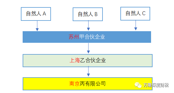 苏州甲合伙企业,其合伙人为ABC自然人。投资了上海乙合伙企业,乙企业投资了南京丙公司。关系如下图所示: