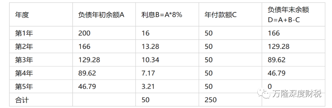 计算金融负债利率:租赁负债现值200万元=年租赁付款额50万元*(P/A,a%,5),经查找年金现值系数可得出利率为8%。以此计算各期的利息费用如下:
