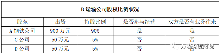 A公司为钢铁生产企业,B公司系船运企业是A公司的控股子公司,主要业务是为A公司运输煤炭及钢铁,AB公司一体化经营,B公司注册资本为1000万元,A股东实缴金额900万元占90%股份,实际经营B公司,C股东出资50万元占股5%,D股东出资50万元占股5%,均不参与B公司经营亦与B公司无往来,各股东均实缴到位,股权比例如下表: