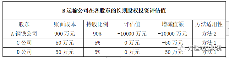 持续经营前提下,如果按照方法1将该长投评估为零,理论上B公司的各项损失引起的净资产-10,000.00万元将无处反映,现实中也由于A公司无法实施有限公司的“恶意破产”,对A公司的损失也不可能仅仅是长期股权投资账面价值的清零这么简单,所以不适用于方法1。现在评估人员要对A钢铁公司账上的长期股权投资B公司进行评估,B公司近年来经营不善且持续巨额亏损,主要原因是船运行业大环境较差和一定程度的利益输送(母公司及集团内兄弟公司),基准日B公司的企业价值评估值成本法计算为-10,000.00万元。