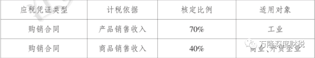 《中华人民共和国印花税法》实施前,各省制定了《印花税核定征收暂行办法》,对购销合同类印花税的纳税人,按下列标准确定核定征收的比例,比如说江苏省的文件: