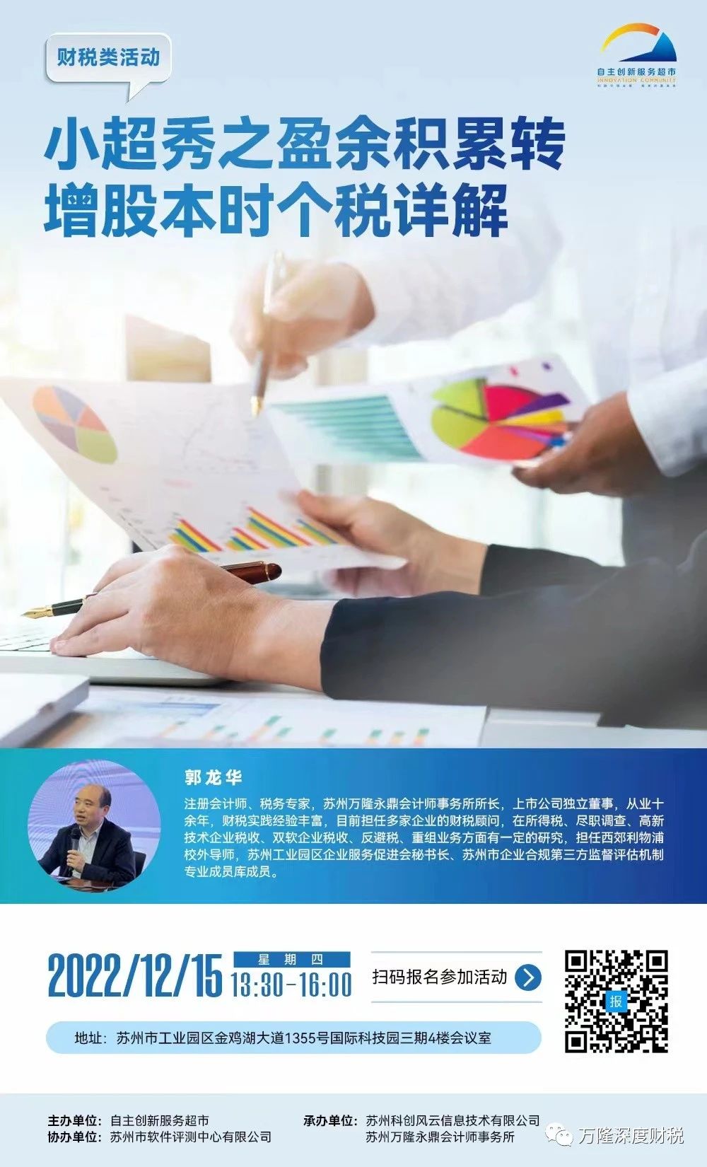 2022年12月15日下午2点,针对盈余积累转增股本时个税相关问题,苏州自主创新服务超市特邀苏州万隆永鼎会计师事务所郭龙华老师为大家带来专场解读,诚挚邀请各企业前来听讲,具体报名方式可点击下方阅读原文链接或图片扫描报名。