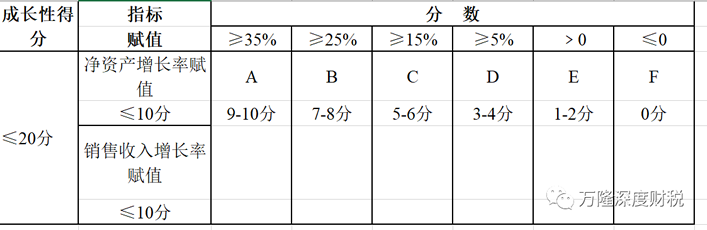 其中:成长性指标总分为20分,主要从净资产和销售收入两个部分打分,评分标准如下: